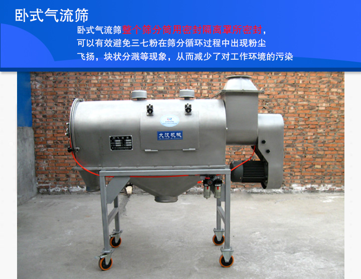 臥式氣流篩整個篩分筒用密封隔離罩所密封,可以有效避免三七粉在篩分循環(huán)過程中出現(xiàn)粉塵飛揚,塊狀分濺等現(xiàn)象,從而減少了對工作環(huán)境的污染。