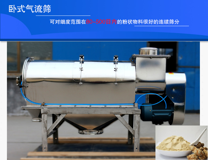 臥式氣流篩可對細度范圍在80-500目內的粉狀物料很好的連續(xù)篩分。
