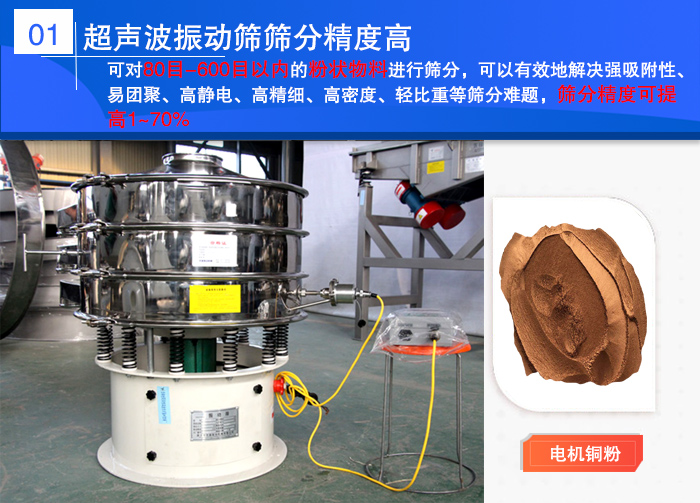 超聲波振動(dòng)篩可對(duì)80目-600目以?xún)?nèi)的粉狀物料進(jìn)行篩分,可以有效地解決強(qiáng)吸附性、易團(tuán)聚、高靜電、高精細(xì)、高密度、輕比重等篩分難題,篩分精度可提高1~70%,可對(duì)電解銅粉進(jìn)行高精度篩分。