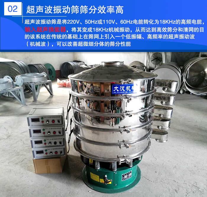 超聲波振動(dòng)篩是將220V、50Hz或110V、60Hz電能轉(zhuǎn)化為18KHz的高頻電能,輸入超聲換能器,將其變成18KHz機(jī)械振動(dòng),從而達(dá)到高效篩分和清網(wǎng)的目的該系統(tǒng)在傳統(tǒng)的基礎(chǔ)上在篩網(wǎng)上引入一個(gè)低振幅、高頻率的超聲振動(dòng)波(機(jī)械波),可以改善超微細(xì)分體的篩分性能,超聲波振動(dòng)篩無(wú)需增加清網(wǎng)裝置,篩分效率高。
