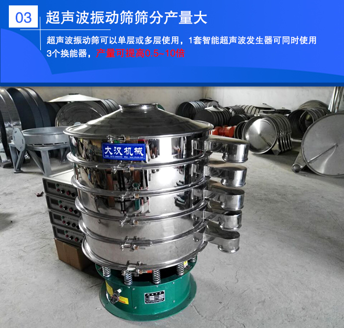 超聲波振動(dòng)篩可以單層或多層使用,1套智能超聲波發(fā)生器可同時(shí)使用3個(gè)換能器,產(chǎn)量可提高0.5~10倍。