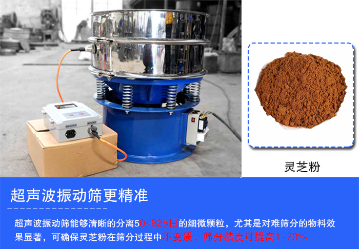 超聲波振動(dòng)篩能夠清晰的分離50~625目的細(xì)微顆粒,尤其是對(duì)難篩分的物料效果顯著,可確保靈芝粉在篩分過程中不變質(zhì),篩分精度可提高1-70%。