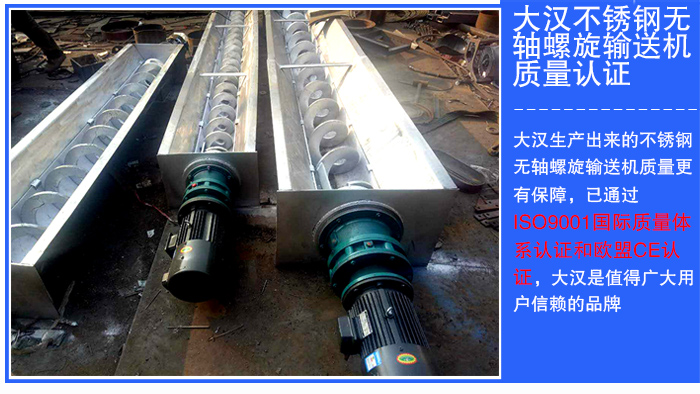新鄉(xiāng)大漢歷經(jīng)20多年艱苦奮斗,對于設(shè)備的做工、材質(zhì)選用、技術(shù)投入等方面都嚴(yán)格按照高標(biāo)準(zhǔn)化執(zhí)行,不斷改善現(xiàn)有的設(shè)備水平,對產(chǎn)品質(zhì)量情況進(jìn)行監(jiān)督管理,經(jīng)過層層的嚴(yán)格篩選,大漢生產(chǎn)出來的不銹鋼無軸螺旋輸送機(jī)質(zhì)量更有保障,已通過ISO9001國際質(zhì)量體系認(rèn)證和歐盟CE認(rèn)證,大漢是值得廣大用戶信賴的品牌。