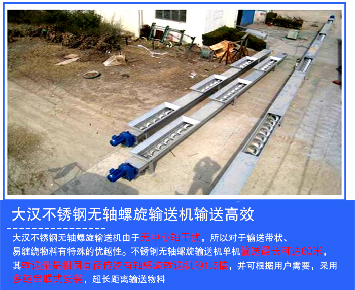 大漢不銹鋼無軸螺旋輸送機(jī)由于無中心軸干擾,所以對于輸送帶狀、易纏繞物料有特殊的優(yōu)越性。不銹鋼無軸螺旋輸送機(jī)單機(jī)輸送長可達(dá)60米,其輸送量是相同直徑傳統(tǒng)有軸螺旋輸送機(jī)的1.5倍,并可根據(jù)用戶需要,采用多級串聯(lián)式安裝,超長距離輸送物料,輸送更高效。