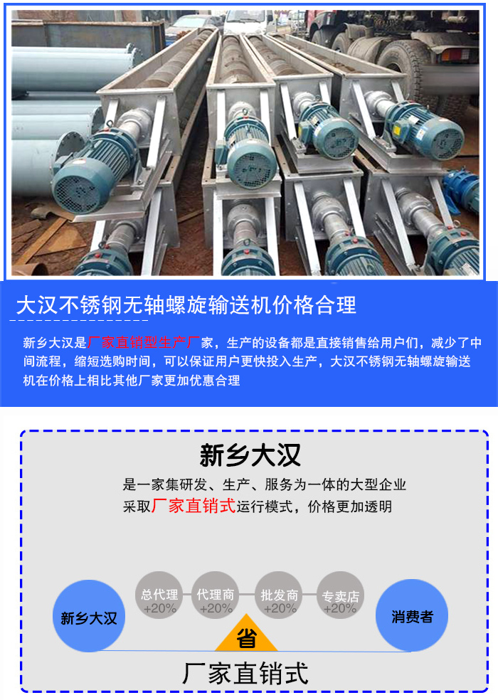 新鄉(xiāng)大漢是廠家直銷型生產(chǎn)廠家,生產(chǎn)的設(shè)備都是直接銷售給用戶們,減少了中間流程,縮短選購時(shí)間,可以保證用戶更快投入生產(chǎn),大漢不銹鋼無軸螺旋輸送機(jī)在價(jià)格上相比其他廠家更加優(yōu)惠合理。