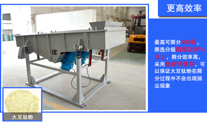 大豆肽粉具有很好的水溶性、持水性、起泡性,是一種新型多功能營養(yǎng)配料,可廣泛地用于保健食品、嬰幼兒食品、運(yùn)動食品、發(fā)酵制品及臨床營養(yǎng)制劑等。篩分大豆鈦粉可以使用哪種振動篩呢?一般情況下,篩分大豆鈦粉會選擇直線振動篩。