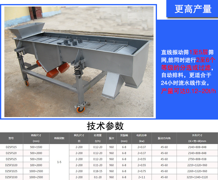 直線振動篩1至5層篩網(wǎng),能同時進(jìn)行2至6個等級的分選或過濾,自動排料,更適合于24小時流水線作業(yè),產(chǎn)量可達(dá)0.12~20t/h。