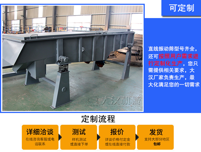 直線振動篩型號齊全,還可按照用戶需求進(jìn)行定制化生產(chǎn),您只需提供相關(guān)要求,大漢廠家負(fù)責(zé)生產(chǎn),大化滿足您的一切需求。