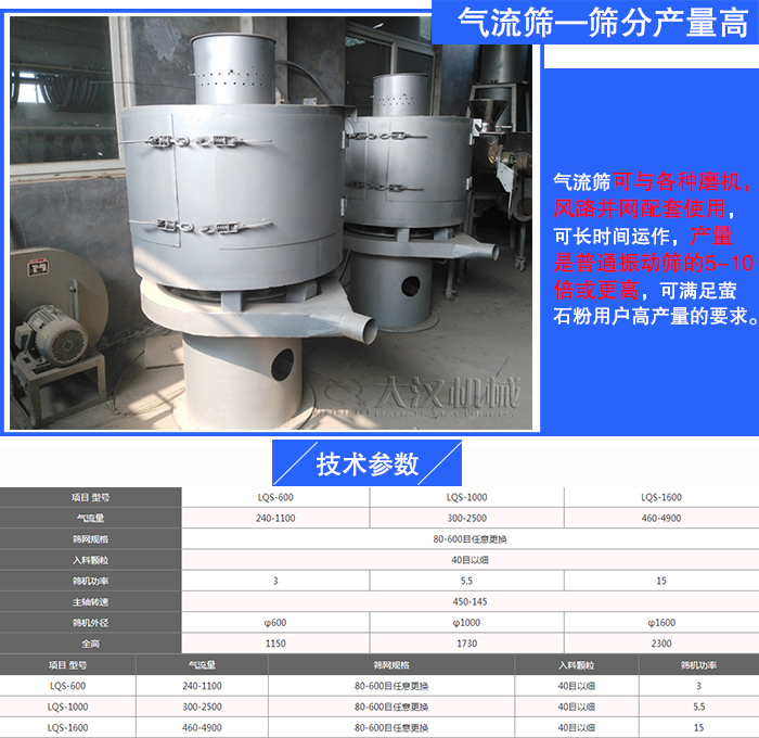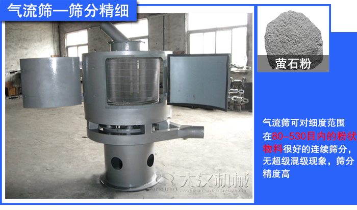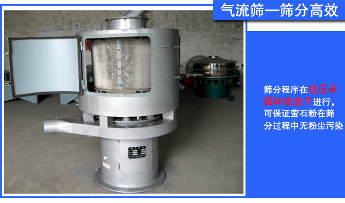 氣流篩可與各種磨機(jī),風(fēng)路并網(wǎng)配套使用,可長時(shí)間運(yùn)作,產(chǎn)量是普通振動(dòng)篩的5-10倍或更高,可滿足螢石粉用戶高產(chǎn)量的要求。