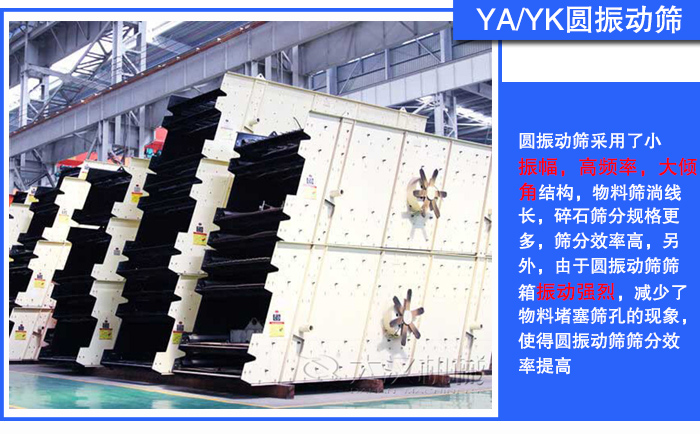 圓振動(dòng)篩采用了小振幅,高頻率,大傾角結(jié)構(gòu),物料篩淌線長,碎石篩分規(guī)格更多,篩分效率高,另外,由于圓振動(dòng)篩篩箱振動(dòng)強(qiáng)烈,減少了物料堵塞篩孔的現(xiàn)象,使得圓振動(dòng)篩篩分效率提高。