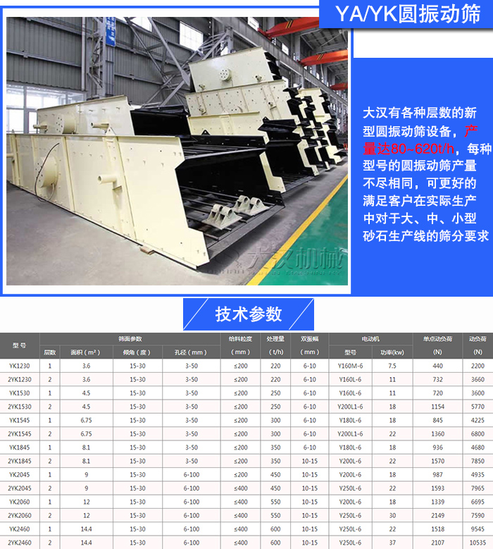大漢有各種層數(shù)的新型圓振動(dòng)篩設(shè)備,產(chǎn)量達(dá)80~620t/h,每種型號(hào)的圓振動(dòng)篩產(chǎn)量不盡相同,可更好的滿足客戶在實(shí)際生產(chǎn)中對(duì)于大、中、小型砂石生產(chǎn)線的篩分要求,而且每噸物料所消耗的電能少,高產(chǎn)更能耗低。