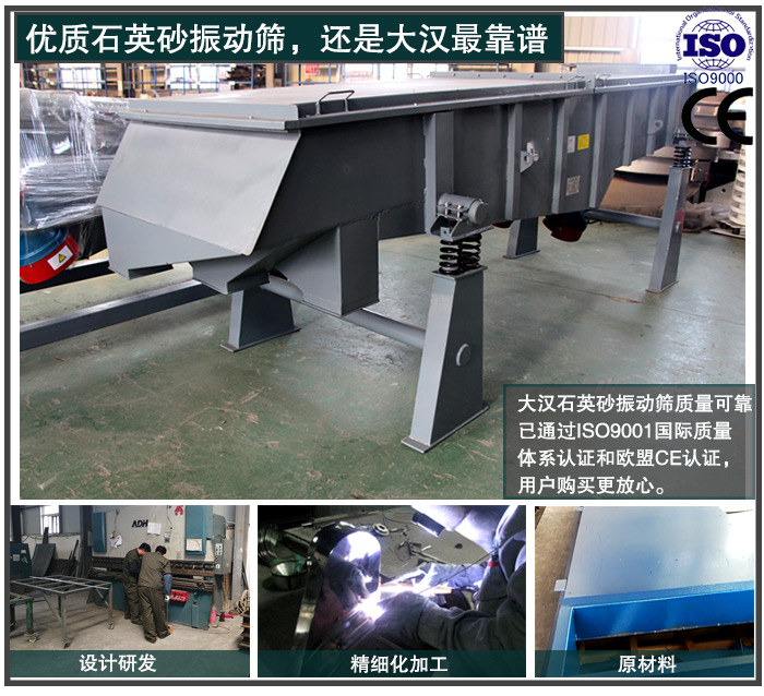 新鄉(xiāng)大漢作為一家擁有20多年生產(chǎn)經(jīng)驗(yàn)的振動篩廠家,設(shè)備配置先進(jìn),生產(chǎn)經(jīng)驗(yàn)豐富,在產(chǎn)品的設(shè)計、技術(shù)、工藝及選材等方面時刻將質(zhì)量放在首位,不因利潤的誘惑而放棄對質(zhì)量的追求,大漢石英砂振動篩質(zhì)量可靠,已通過ISO9001國際質(zhì)量體系認(rèn)證和歐盟CE認(rèn)證,用戶購買更放心。