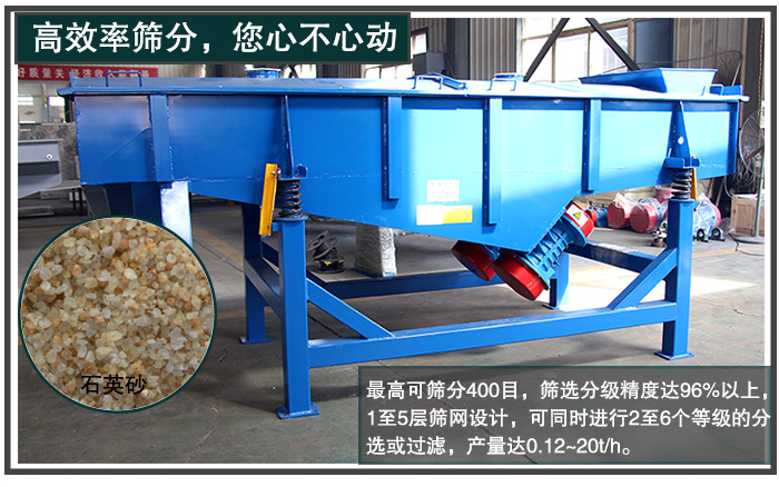 大漢石英砂振動篩篩分高效,高可篩分400目,篩選分級精度達(dá)96%以上,1至5層篩網(wǎng)設(shè)計,可同時進(jìn)行2至6個等級的分選或過濾,產(chǎn)量達(dá)0.12~20t/h,用戶使用更安心。