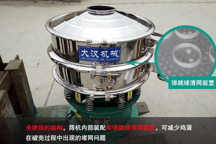 不銹鋼振動篩采用了全密閉的結(jié)構(gòu),篩機(jī)內(nèi)部裝配有彈跳球清網(wǎng)裝置,可以在篩機(jī)工作時對篩面進(jìn)行清潔處理,減少雞蛋在破殼過程中出現(xiàn)的堵網(wǎng)問題,進(jìn)一步提高其篩分效率。