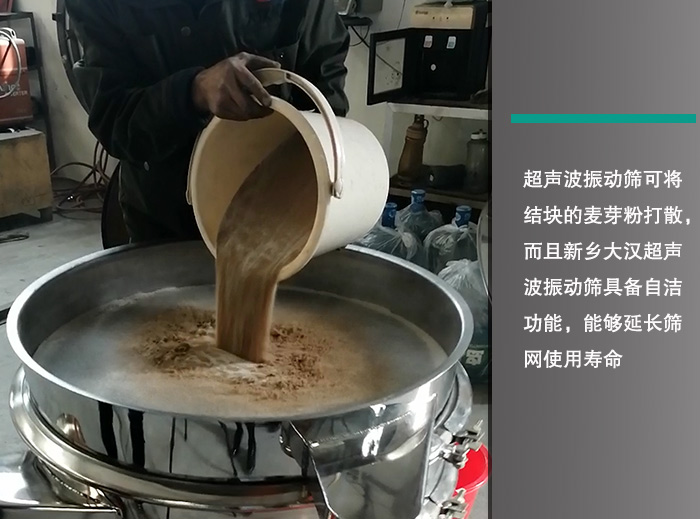 如果使用普通振動(dòng)篩,麥芽粉在篩分中容易出現(xiàn)結(jié)塊、漏料的情況,而使用超聲波振動(dòng)篩能夠很好的避免這一現(xiàn)象的發(fā)生,它通過(guò)超聲波換能器將電能轉(zhuǎn)換為波能傳遞到篩面上,可將結(jié)塊的麥芽粉打散,而且新鄉(xiāng)大漢超聲波振動(dòng)篩具備自潔功能,能夠延長(zhǎng)篩網(wǎng)使用壽命。