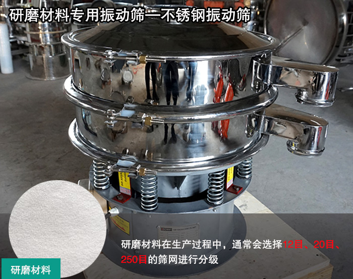 不銹鋼振動(dòng)篩可篩分至500目或0.028mm粉狀及顆粒狀物料,非常符合研磨材料篩分目數(shù)要求。
