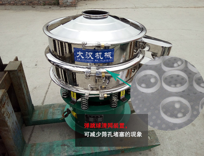 不銹鋼振動(dòng)篩裝有彈跳球清網(wǎng)裝置,可減少篩孔堵塞的現(xiàn)象,提高研磨材料的篩分效果。
