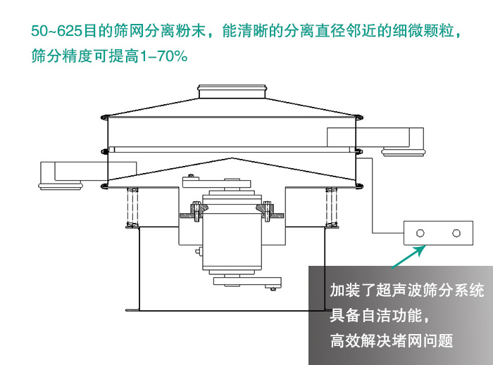 由于加裝了超聲波篩分系統(tǒng),具備自潔功能,可以高效解決強吸附性、易團聚、高靜電、高精細、高密度、輕比重等篩分難題,解決物料在篩分過程中的堵網(wǎng)問題。