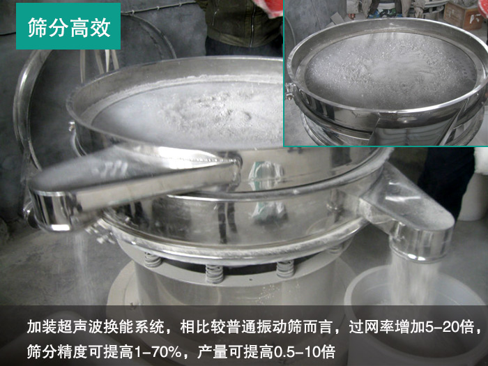 ②我們的微礦粉超聲波振動(dòng)篩由于加上了超聲波篩分系統(tǒng),因此可以加快團(tuán)聚物、高靜電、高精細(xì)、高密度、比重輕、吸附物料的分離,從而增加其篩分量,相比較普通振動(dòng)篩而言,過(guò)網(wǎng)率增加5-20倍,篩分精度可提高1-70%,產(chǎn)量可提高0.5-10倍,適合日產(chǎn)1000噸微礦粉的超聲波振動(dòng)篩。