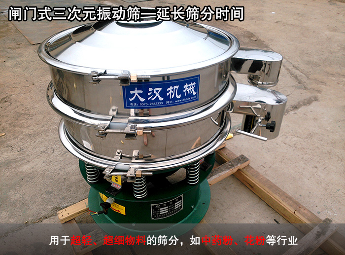 該種類型的三次元振動(dòng)篩是在實(shí)際應(yīng)用中衍生出來的一種產(chǎn)品,是在普通型三次元振動(dòng)篩出料口處加裝閘門,主要是在篩分物料中的雜質(zhì)時(shí)使用,通過關(guān)閉出料口使物料進(jìn)行充分篩分。用戶可以一次投料長久篩分作業(yè),通過控制閘門的開合以達(dá)到良好篩分的目的,這種篩分作業(yè)多用于超輕、超細(xì)物料的篩分,如中藥粉、花粉等行業(yè)。