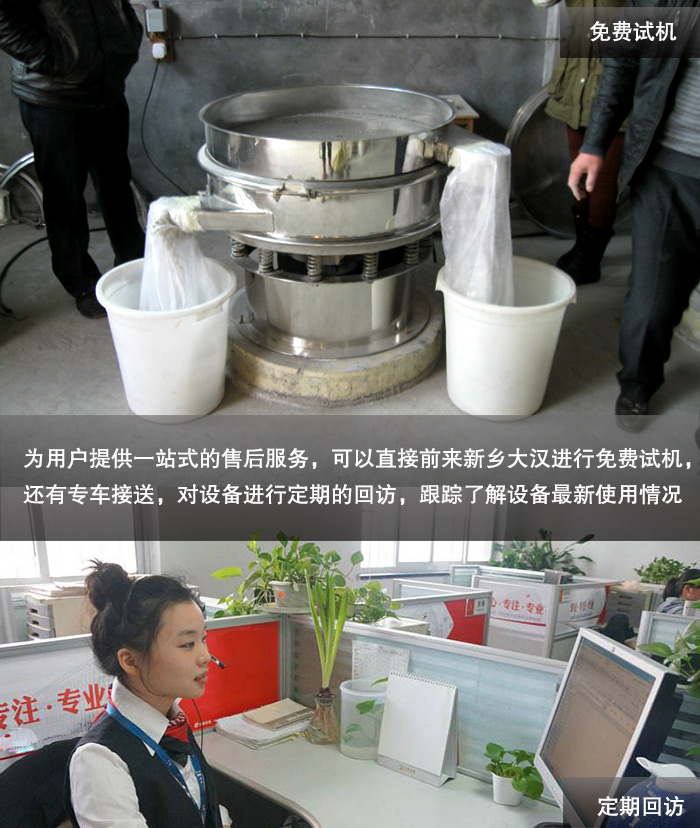 新鄉(xiāng)大漢全心全意為用戶提供一站式的售后服務(wù),如果您需要對三次元振動篩的現(xiàn)場情況還不是很了解的話,可以直接前來新鄉(xiāng)大漢進(jìn)行免費(fèi)試機(jī),還有專車接送,而且大漢還會對設(shè)備進(jìn)行定期的回訪,跟蹤了解設(shè)備使用情況。