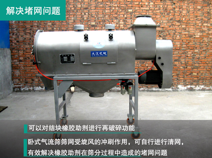 臥式氣流篩可以對結(jié)塊物料進行再破碎功能,特別適合篩分處理輕比重、粘度大、纖維多、有靜電、易團聚的超細微粉和特殊物料,而臥式氣流篩篩網(wǎng)受旋風的沖刷作用,可自行進行清網(wǎng),有效解決橡膠助劑在篩分過程中造成的堵網(wǎng)問題。