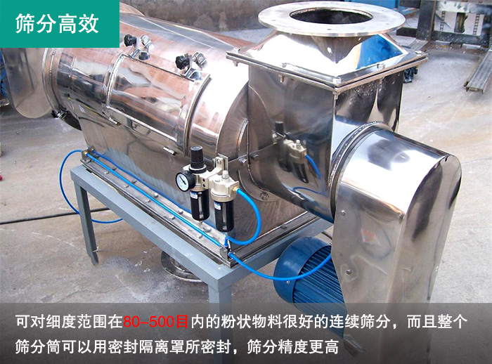 橡膠助劑本身流動性比較差,在篩分過程中容易吸附在篩網(wǎng)上,造成堵網(wǎng),產(chǎn)量要求還大,使用一般的振動篩難以滿足生產(chǎn)的要求,臥式氣流篩也叫做氣旋篩,是一種專門針對微細粉進行高精度篩分的設(shè)備,在篩分橡膠助劑時主要包含以下幾點優(yōu)勢: