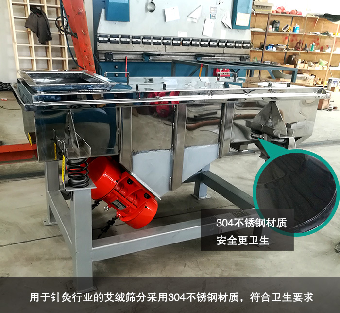 因為艾絨主要用于針灸行業(yè),所以對于衛(wèi)生要求很高,因此選擇的直線振動篩為不銹鋼材質,能夠保證更加干凈衛(wèi)生。