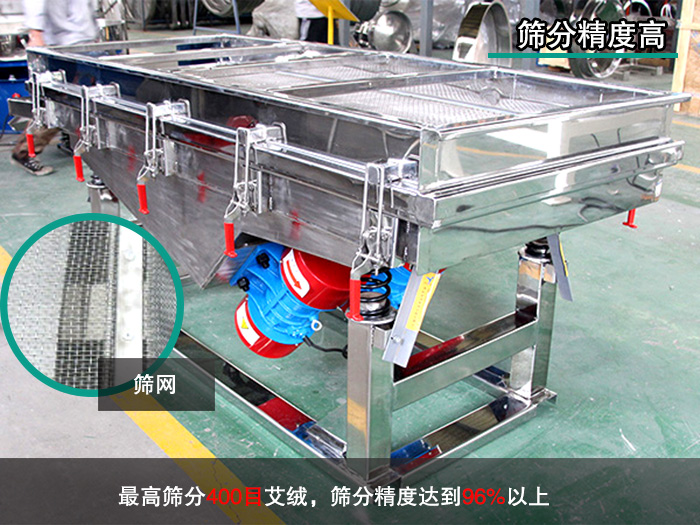 直線振動篩可以高篩分400目艾絨,篩分精度達到96%以上。