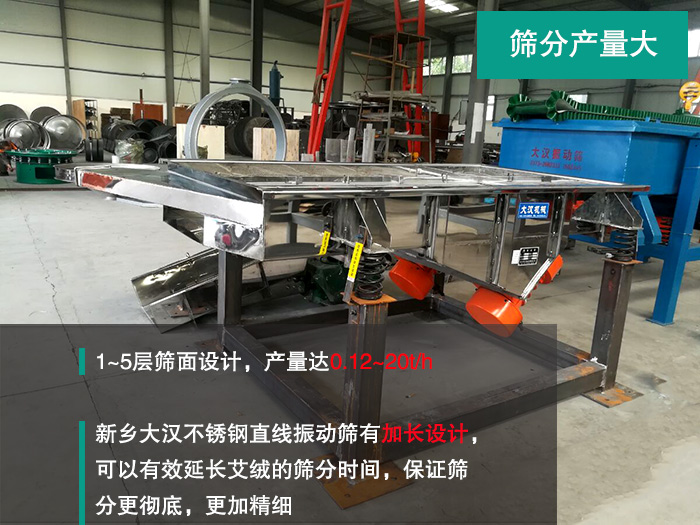 ①不銹鋼直線振動篩越長,艾絨在篩面上被篩分的時間約長,因此越精細。