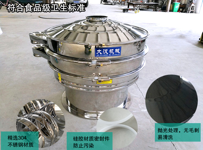 蛋糕粉終用于食品行業(yè),所以在選擇振動篩設(shè)備是還要考慮其衛(wèi)生情況,大漢不銹剛振動篩采用304不銹鋼材質(zhì),進(jìn)過嚴(yán)格的拋光處理,再加上其采用硅膠材質(zhì)的密封件,防止蛋糕粉在篩分過程中被外界環(huán)境所污染,完全符合食品衛(wèi)生標(biāo)準(zhǔn),用戶可以放心使用。