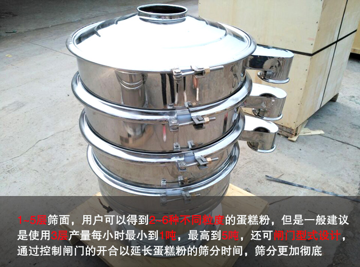 不銹鋼振動篩篩面層數(shù)有1~5層,用戶可以得到2~6種不同粒度的蛋糕粉,但是一般建議是使用3層,產(chǎn)量每小時小到1噸,高到5噸,另外,為了更好地對蛋糕粉進(jìn)行篩分,大漢廠家還設(shè)計了閘門型旋振篩,用戶可以一次投料長久篩分作業(yè),通過控制閘門的開合以達(dá)到良好篩分的目的,篩分效率高。