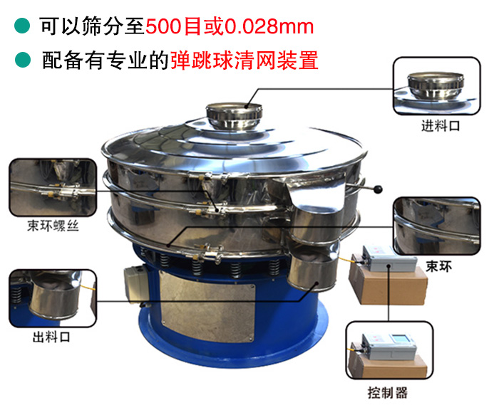 不銹鋼振動篩可以篩分500目或0.028mm顆粒狀、粉末狀物料,篩分精度高,另外,還配備有專業(yè)的彈跳球清網(wǎng)裝置,可保證在篩分蛋糕粉的過程中不會產(chǎn)生堵網(wǎng)現(xiàn)象。