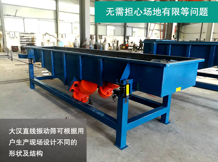 大漢直線振動(dòng)篩可根據(jù)用戶生產(chǎn)現(xiàn)場(chǎng)設(shè)計(jì)不同的形狀及結(jié)構(gòu),輕松解決用戶場(chǎng)地有限等難題,保證每一臺(tái)直線振動(dòng)篩都能匹配到用戶的實(shí)際需要。