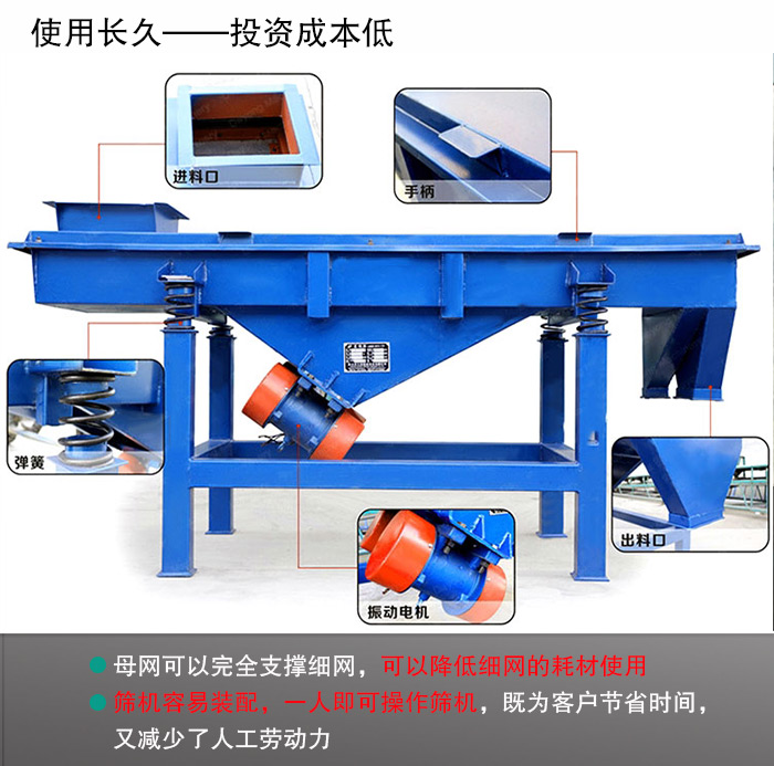 直線振動(dòng)篩采用獨(dú)特的篩網(wǎng)結(jié)構(gòu)設(shè)計(jì),其母網(wǎng)可以完全支撐細(xì)網(wǎng),因此細(xì)網(wǎng)使用壽命長,從而可以降低細(xì)網(wǎng)的耗材使用,而且篩網(wǎng)更換方便和快速,只需3-5分鐘,并且篩機(jī)容易裝配,一人即可操作篩機(jī),既為客戶節(jié)省時(shí)間,又減少了人工勞動(dòng)力,減少用戶的投資成本。