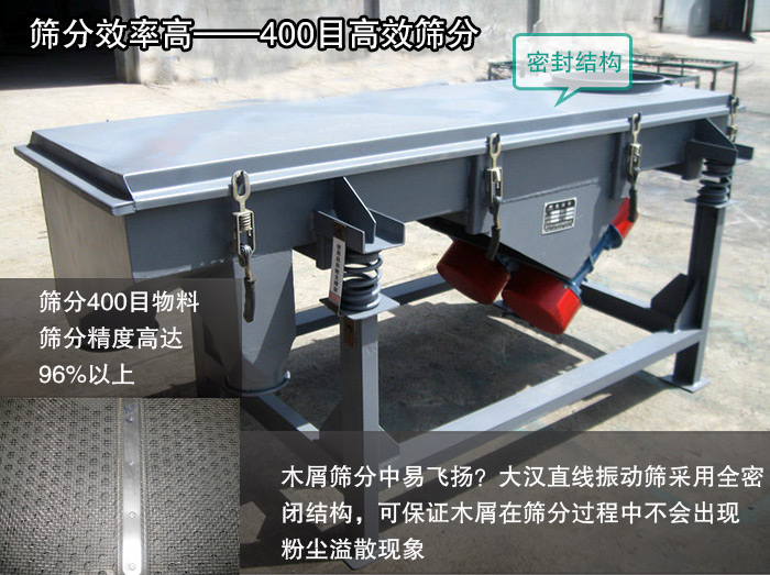 直線振動(dòng)篩可以篩分400目物料,篩分精度高達(dá)96%以上,采用全密閉結(jié)構(gòu),可保證木屑在篩分過程中不會(huì)出現(xiàn)粉塵溢散現(xiàn)象,可以進(jìn)一步提高直線振動(dòng)篩篩分效率。
