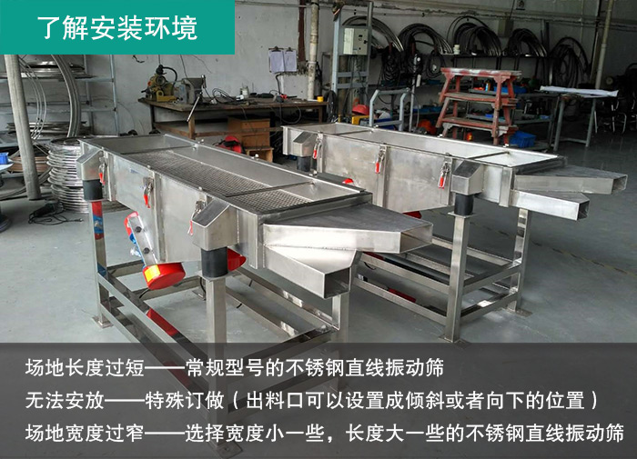 如果遇到場(chǎng)地長(zhǎng)度短,選擇常規(guī)型號(hào)的不銹鋼直線振動(dòng)篩篩是無(wú)法安放的,這時(shí)就需要特殊訂做了,比如出料口可以設(shè)置成傾斜或者向下的位置,具體可以可以根據(jù)您的需求而定。當(dāng)場(chǎng)地寬度過(guò)窄,不銹鋼直線振動(dòng)篩就可以選擇寬度小一些,長(zhǎng)度大一些的直線篩設(shè)備。