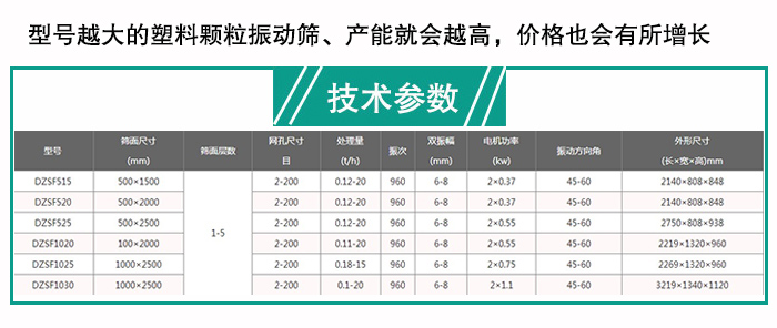 2、型號(hào)選擇:各種塑料顆粒振動(dòng)篩型號(hào)多樣,型號(hào)越大的塑料顆粒振動(dòng)篩、產(chǎn)能就會(huì)越高,相應(yīng)的價(jià)格也會(huì)有所增長(zhǎng)。