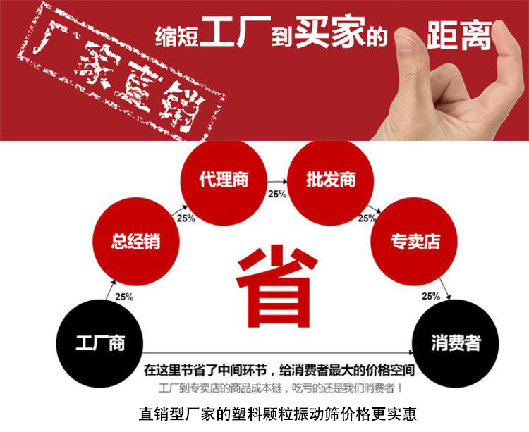 3、廠家模式:直銷型廠家的塑料顆粒振動(dòng)篩價(jià)格更實(shí)惠,因?yàn)闇p少中間費(fèi)用,而在代理商處購(gòu)會(huì)的塑料顆粒振動(dòng)篩設(shè)備價(jià)格就會(huì)偏高。