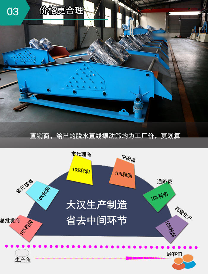 大漢公司是一家直銷商,給出的脫水直線振動(dòng)篩均為工廠價(jià),無中間商,銷售環(huán)節(jié)少,產(chǎn)生的額外費(fèi)用低,相對來說,更劃算。
