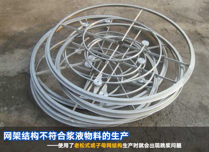 漿液類(lèi)物料的篩分設(shè)備多為圓形振動(dòng)篩。該形式的設(shè)備所用網(wǎng)架結(jié)構(gòu)可分為老松式網(wǎng)架、子母網(wǎng)架、膠粘網(wǎng)架。如在漿液生產(chǎn)過(guò)程中網(wǎng)架結(jié)構(gòu)使用了老松式或子母網(wǎng)結(jié)構(gòu)生產(chǎn)時(shí)就會(huì)出現(xiàn)跳漿問(wèn)題了。這是由于老松式和子母網(wǎng)的網(wǎng)架結(jié)構(gòu)在篩分漿液類(lèi)物料時(shí)由于清網(wǎng)裝置打擊力度較大所以漿液物料進(jìn)入篩面后會(huì)由于激振力過(guò)強(qiáng)使?jié){液跳起出現(xiàn)跳漿問(wèn)題。