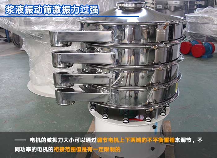 激振力過(guò)強(qiáng)也會(huì)導(dǎo)致漿液振動(dòng)篩出現(xiàn)跳漿情況,振動(dòng)電機(jī)的激振力過(guò)強(qiáng),漿液進(jìn)入篩面上因受到的激振力過(guò)大,就會(huì)出現(xiàn)物料上跳的現(xiàn)象,電機(jī)的激振力大小可以通過(guò)調(diào)節(jié)電機(jī)上下兩端的不平衡重錘來(lái)調(diào)節(jié)。有些客戶(hù)為可增加漿液的篩分產(chǎn)量,在使用的過(guò)程中會(huì)調(diào)節(jié)電機(jī)的激振力而造成激振力過(guò)大,漿液跳漿的現(xiàn)象。