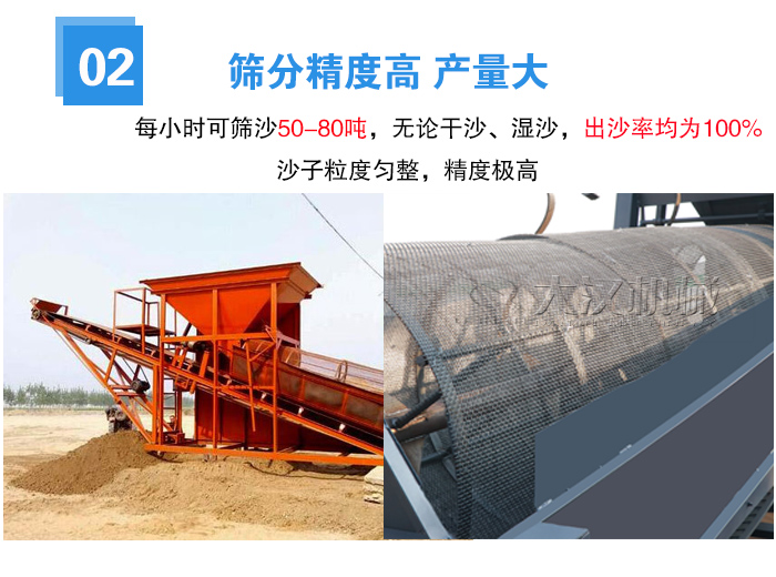 滾筒篩篩沙機通過自身旋轉(zhuǎn)滾動,將沙子和其雜質(zhì)從高處自由落體運動到底部,透過篩網(wǎng),完成篩分,每小時可篩沙50-80噸,無論干沙、濕沙,出沙率均為100%,產(chǎn)量大且沙石分離效果好,所得沙子粒度勻整。