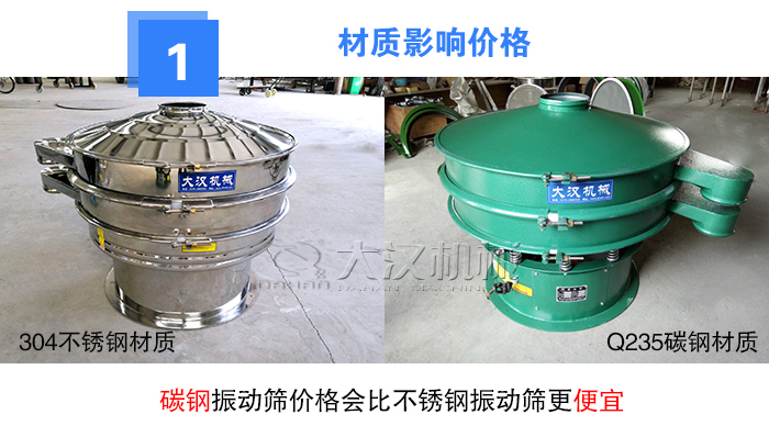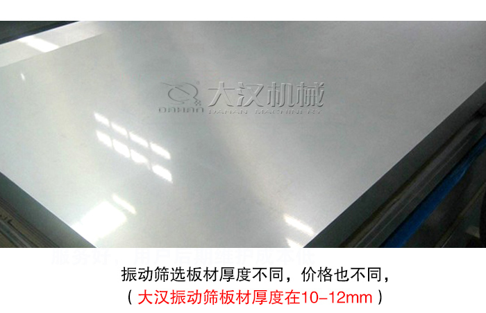 振動篩材質(zhì)一般分為Q235碳鋼材質(zhì)與304不銹鋼材質(zhì)(也有使用316L不銹鋼),選用不同材質(zhì)的振動篩,其價格是不同的,碳鋼振動篩價格會比不銹鋼振動篩更便宜,而且振動篩選板材厚度不同,價格也不同,板材足夠厚,篩機(jī)使用更長久(大漢振動篩板材厚度在10-12mm)。