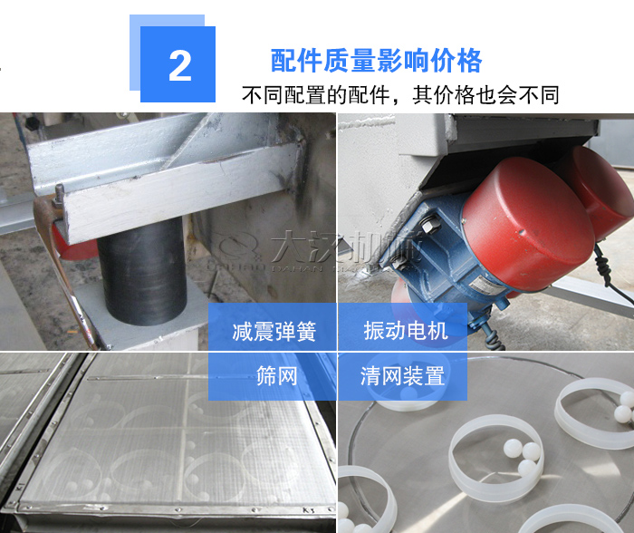 振動篩配件主要有振動電機(jī)、減震彈簧、篩網(wǎng)、清網(wǎng)裝置組成,選擇不同配置的配件,其價格也會不同。