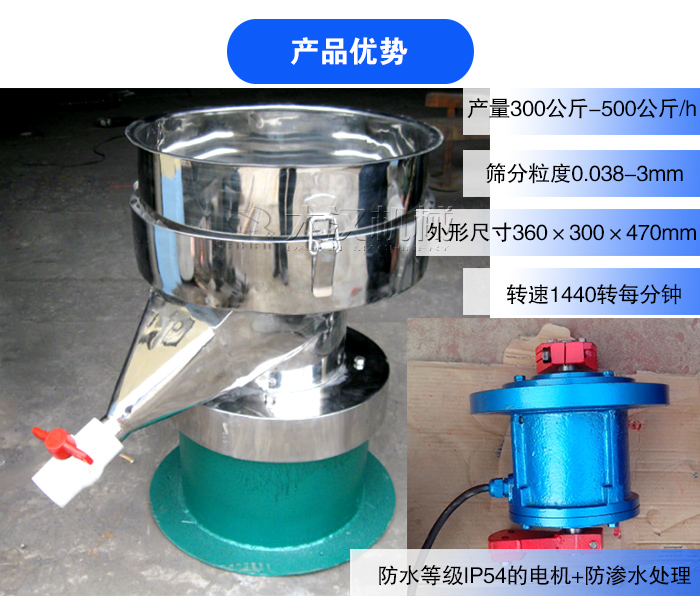 1、大漢液體振動(dòng)篩時(shí)產(chǎn)量300公斤-500公斤/h,篩分粒度0.038-3mm,外形尺寸360×300×470mm,轉(zhuǎn)速1440轉(zhuǎn)每分鐘,篩分效率高。