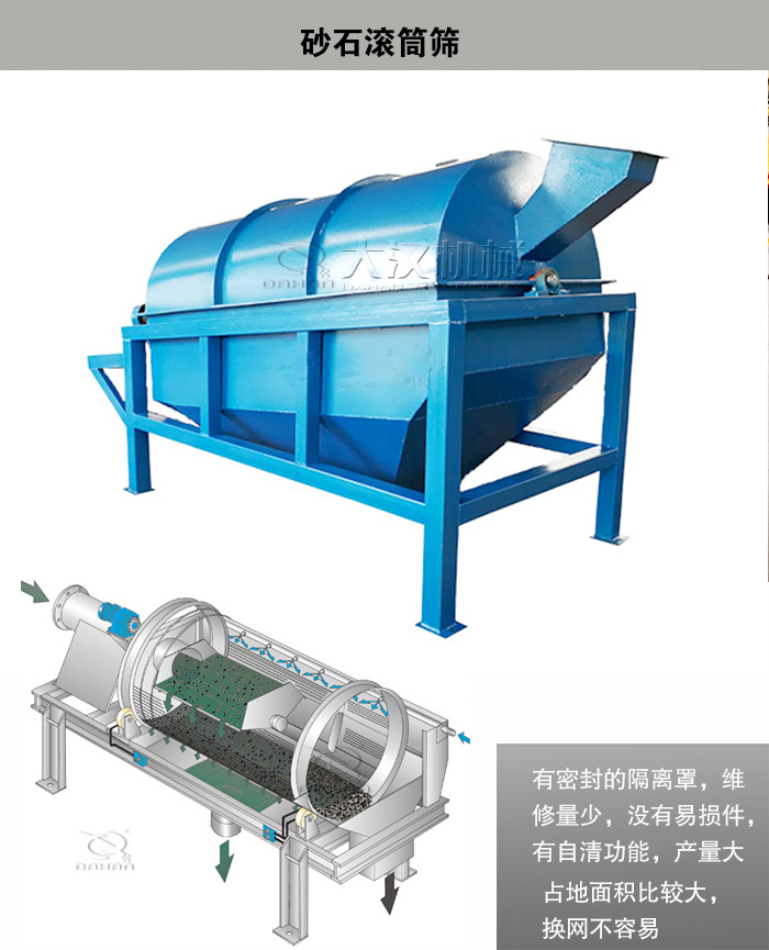 砂石滾筒篩是由若干個圓環(huán)狀扁鋼組成的篩網(wǎng)組成的篩分筒,整體與地平面呈傾斜狀態(tài),外部被密封隔離罩所密封,通過自身的滾動,使合格物料(篩下產(chǎn)品)經(jīng)滾筒后端底部的出料口排出,不合格的物料(篩上產(chǎn)品)經(jīng)滾筒尾部的排料口排出。