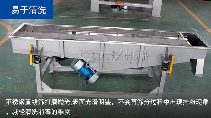 為了保證清潔,食品機械必須定期進行認真的清理消毒,不銹鋼振動篩也是如此,這就決定了食品廠直線篩必須有著清洗工序簡單、方便消毒、不留死角的特點。振動篩廠家在生產(chǎn)每臺不銹鋼直線篩時都會對設(shè)備表面及焊接點進行仔細打磨拋光,確保食品振動篩表面光滑明鑒,不會再篩分過程中出現(xiàn)掛粉現(xiàn)象,減輕清洗消毒的難度。