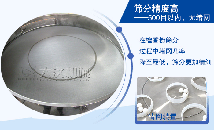 旋振篩適用物料范圍廣,篩分精度高,可以篩分500目或0.028mm,還另外配備有清網(wǎng)裝置(彈跳球),在檀香粉篩分過程中堵網(wǎng)幾率降至低,篩分更加精細。