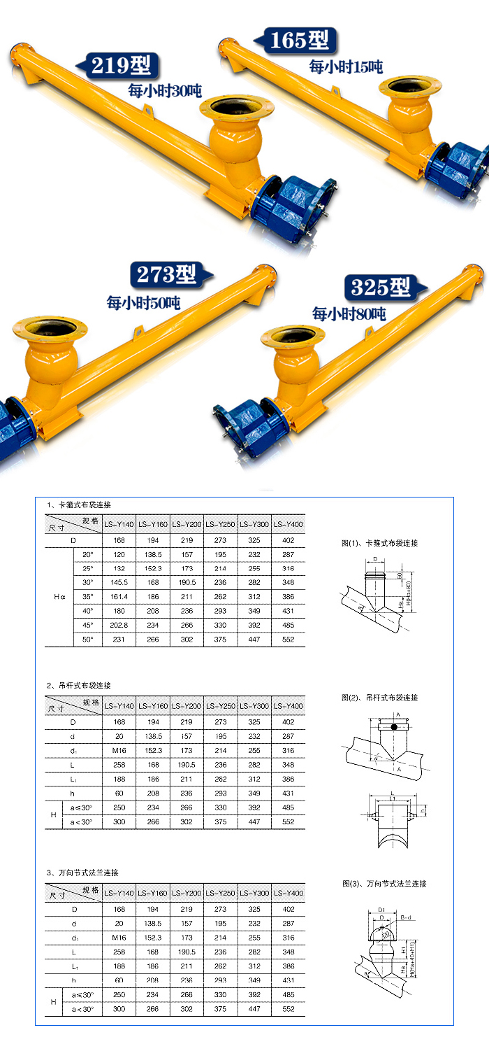 5、螺旋輸送機(jī)進(jìn)料口與水泥倉口連接方式分為:球鉸法蘭剛性連接和吊掛加防水帆布軟連接二種形式??梢曉O(shè)備拆裝頻繁程度決定接口形式。